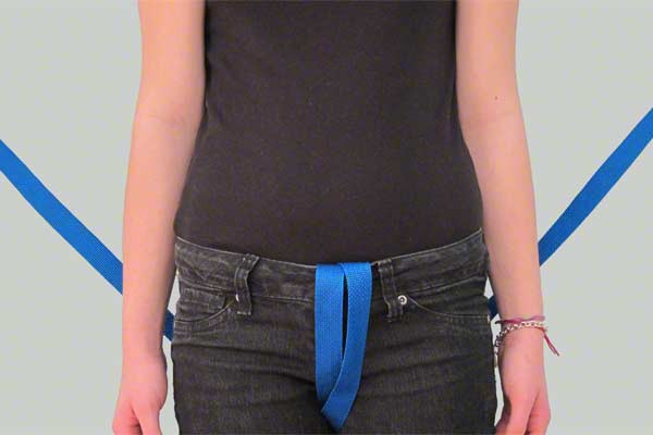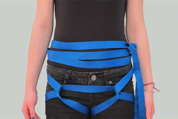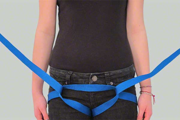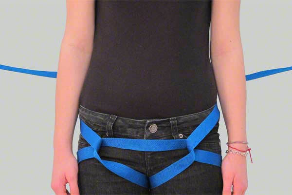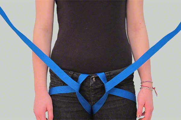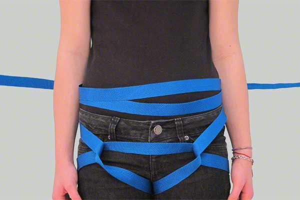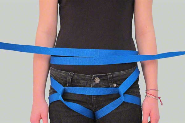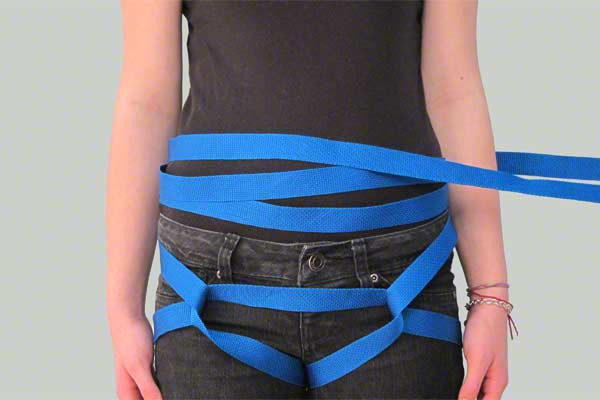 - Pass both ends back between the legs, around the thighs, through the initial loop and around the waist to use up the strap.