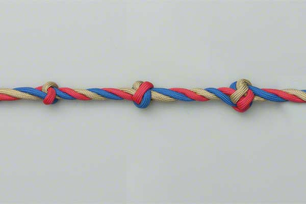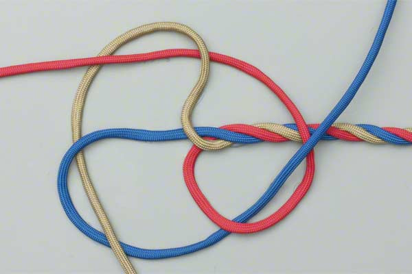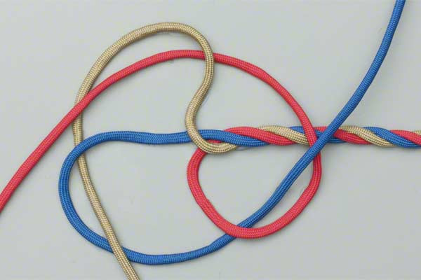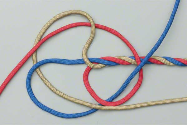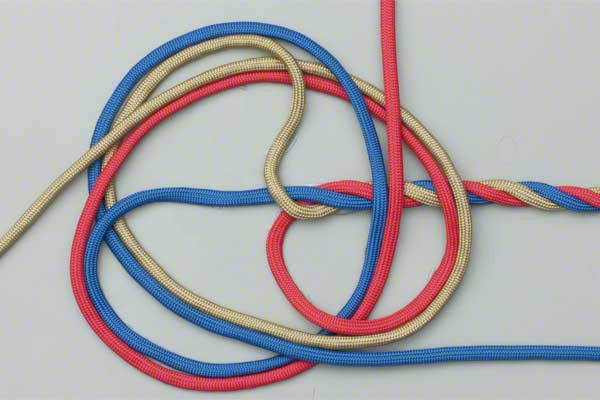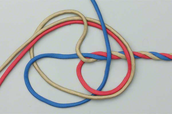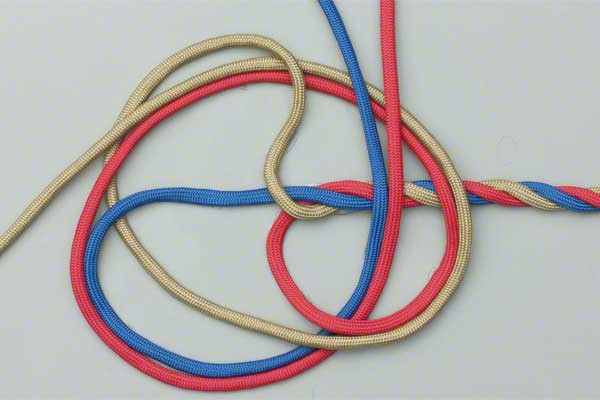 To achieve a perfect result, follow these instructions precisely. For clarity in these steps, we refer to the three strands as Gold, Red, and Blue. When working with a single-colored rope, it may help to mark the ends with colored tape to follow this sequence.