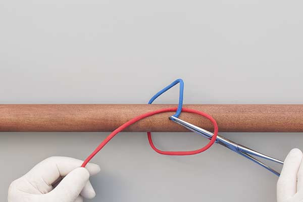 - Position the forceps again and wrap the long end across them. To ensure a true Square Knot, pay attention to the direction of this wrap relative to your first one.