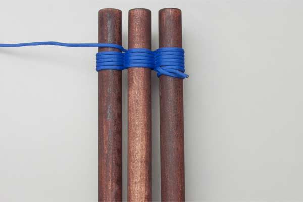- Wrap about six racking turns around the three poles weaving in and out between them. These turns should be neat and laid side-by-side rather than overlapping. The “figure-eight” motion between the poles creates the necessary friction.