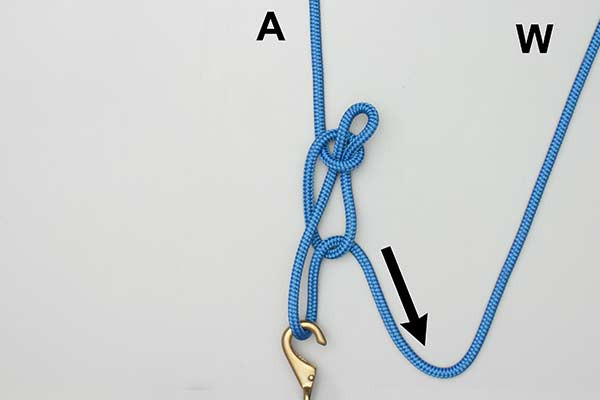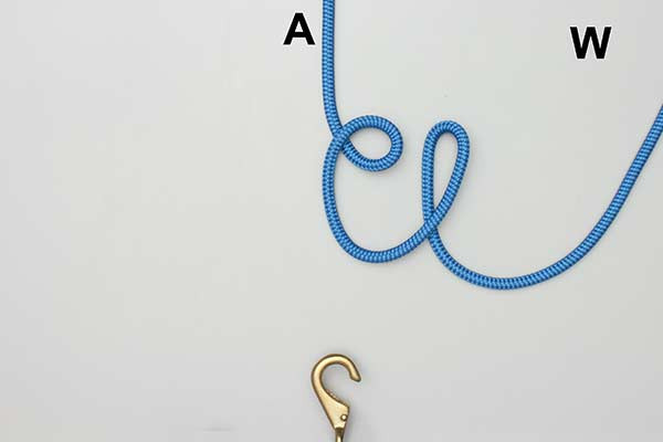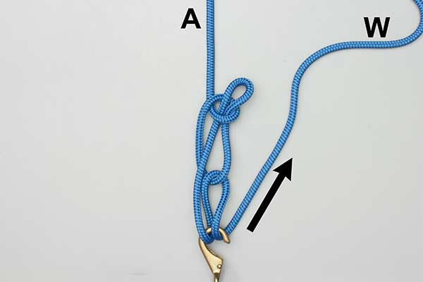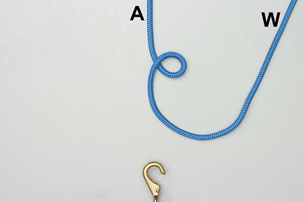 - Make another loop in the Working part (W) and insert it into the first loop to make a hanging bight. This creates the "pulley" mechanism of the knot.