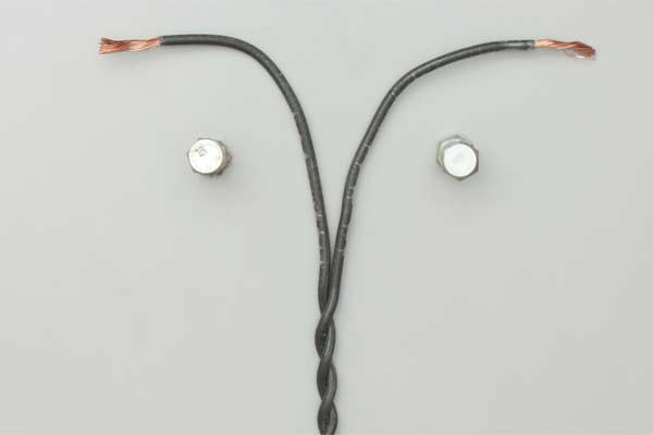 Typically, this is "SPT-1" or "SPT-2" wire, commonly known as zip cord or lamp cord. In an outdoor context, this might be a heavy-duty rubberized cord for power tools. The wire must be split (separated) for several inches to allow enough length for the loops.